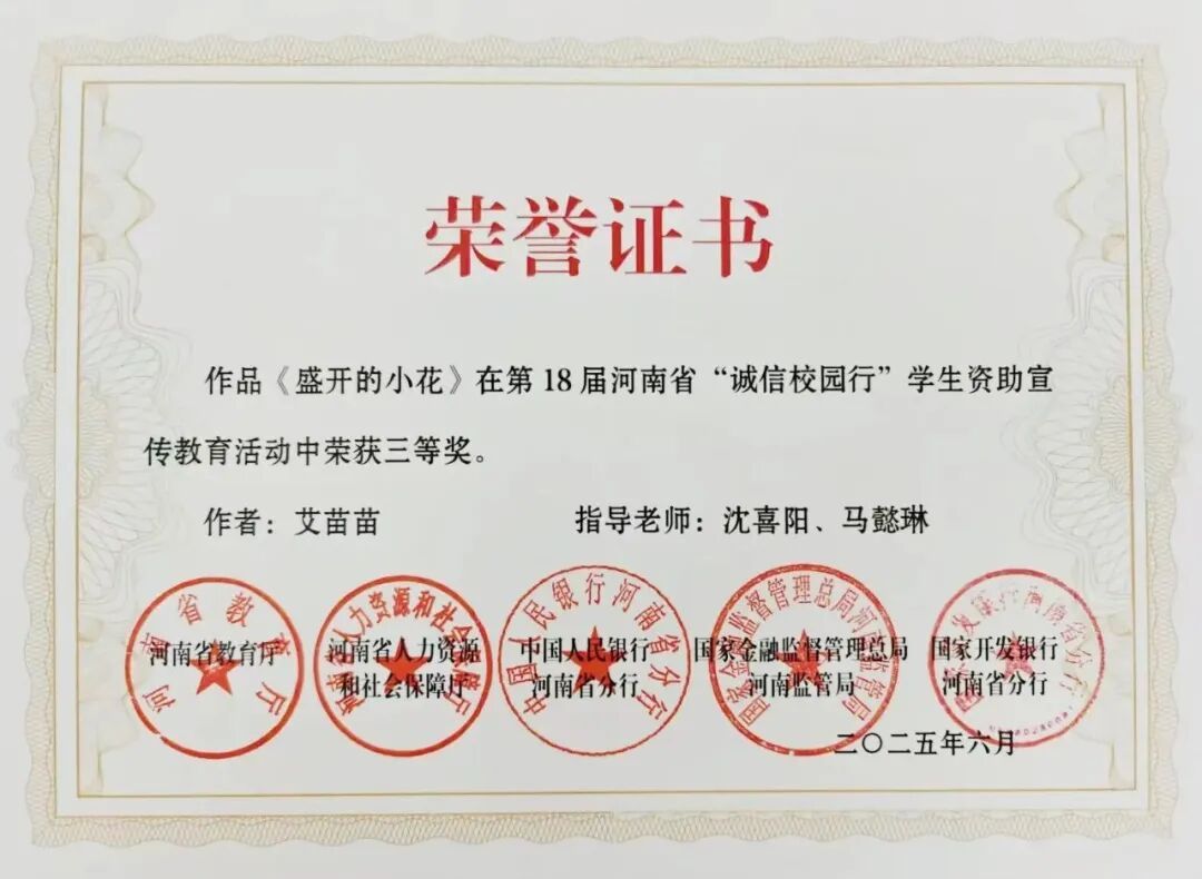 近日,从河南省教育厅传来佳讯,在第十八届河南省“诚信校园行”学生资助宣传教育活动中,william威廉亚洲官方2023级汉语国际教育专业艾苗苗同学获三等奖。
