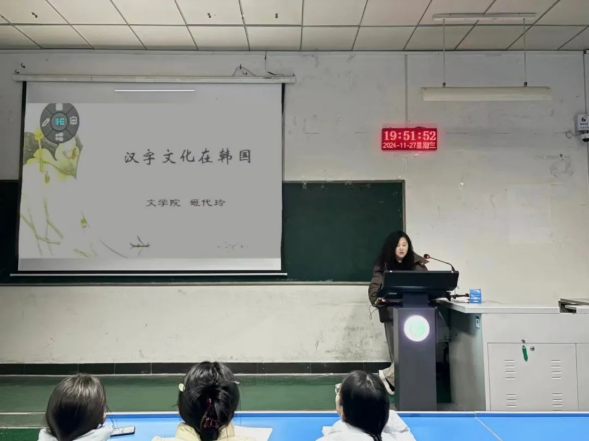 2024年11月27日晚,国鼎文化讲堂之《汉字文化在韩国》于2号教学楼2306教室顺利开讲。此次讲座由文学院姬代玲博士担任主讲。